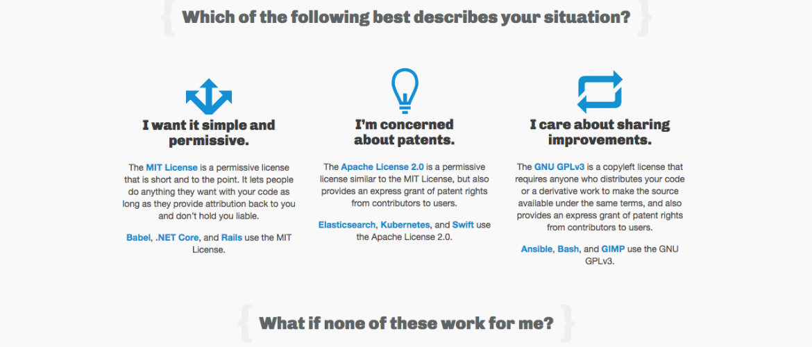Well, we ran across this useful site full of information about the entire spectrum of open source licensing alternatives, thanks to Github. The site is called – Choose A License.