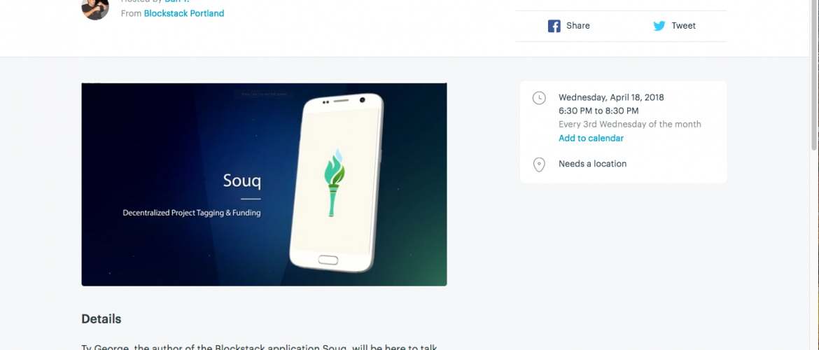 Next Meetup: Blockstack Applications – Souq: Developer of Souq – Ty George – will be the main speaker on all things Souq and developing on Blockstack.